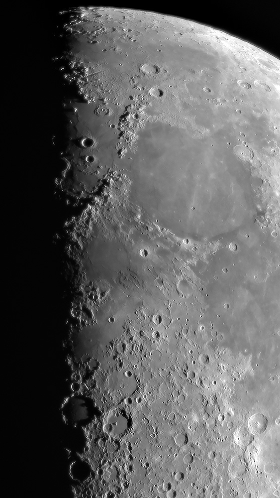 En bild på månen under fas där Mare Imbrium ses med bergskammar där högsta berget är synligt med hela 5500 m.